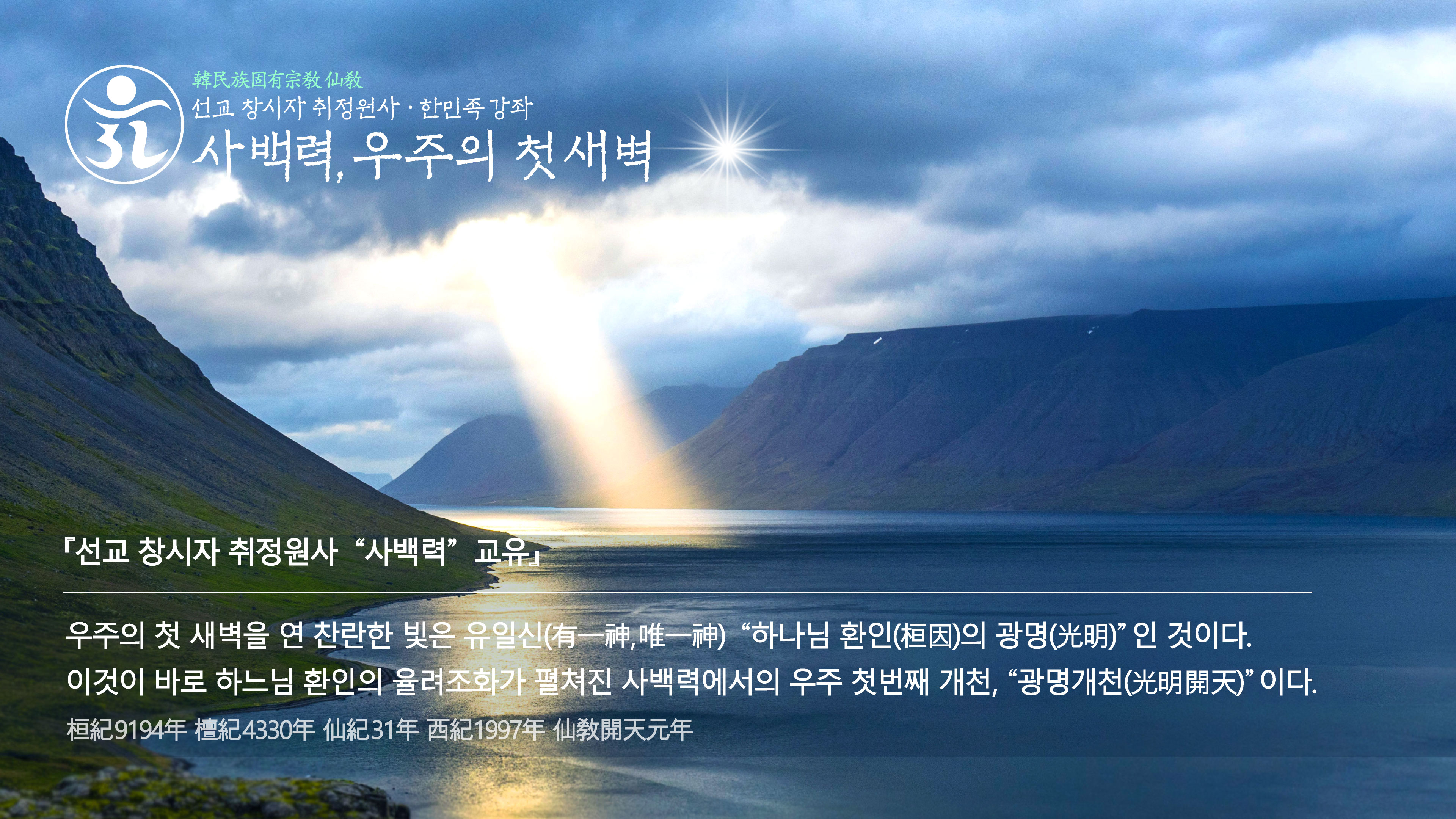 환인께서 홀로 신으로 화하신 사백력의 하늘, 사백력(斯白力)은 시베리아 혹은 새벽녘의 단순한 음차가 아니고, “우주의 첫 새벽” 즉 “천지개벽”을 뜻하는 말이다. 사백력에는 한민족의 하느님 환인께서 빛으로써 세상을 창조하시고 그 빛을 처음 받은 땅이 한민족의 나라 조선(朝鮮)이라는 의미가 들어있다. 》 라고 교유하여 주셨습니다.