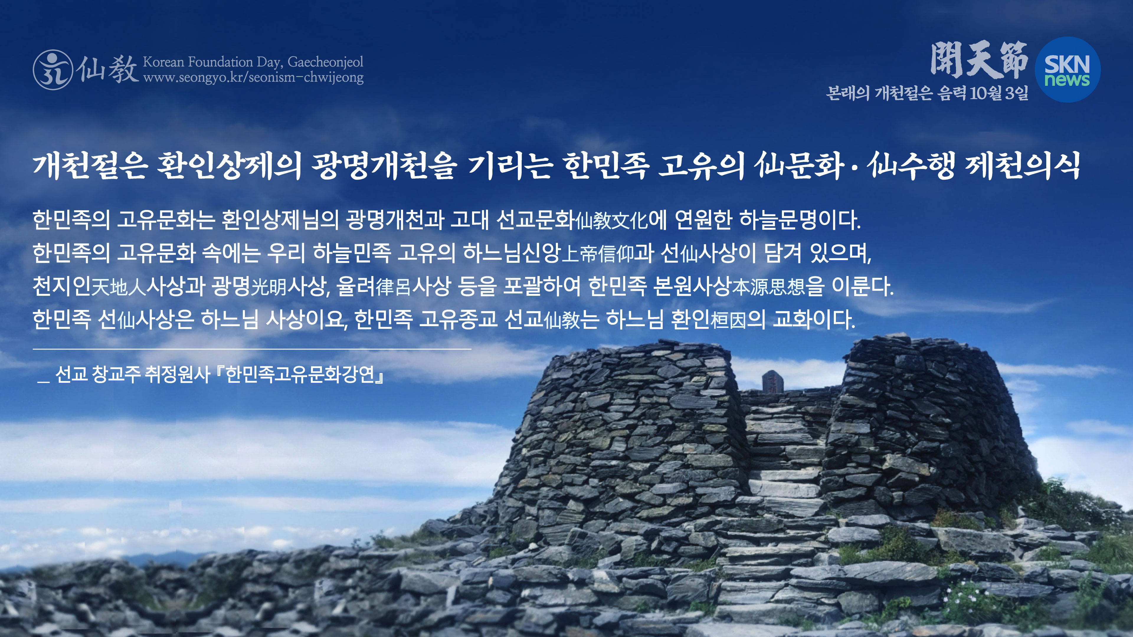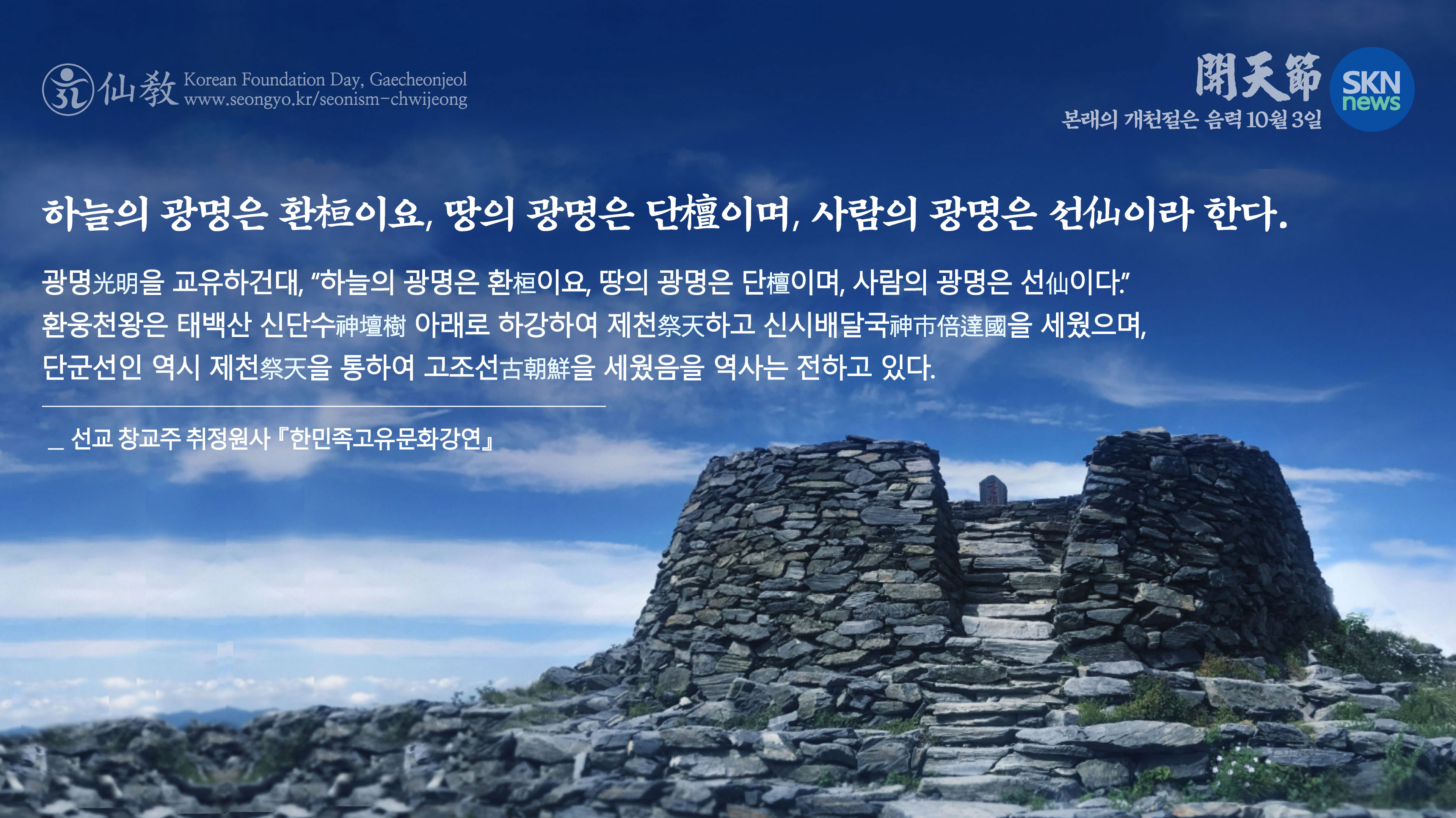 ※ 본 콘텐츠는 선교 창시자 취정원사聚正元師께서 선교경전 『仙敎典』 (1991~1997)에 밝히어 놓으신 「개천교유開天敎諭」 에 근거하여, 환기9219년 임인년 개천절에 취정원사께서 선교 교단과 각 교당에 「개천교유문開天敎諭文」으로 내리신 내용의 일부를 실어 수행대중에 전합니다.