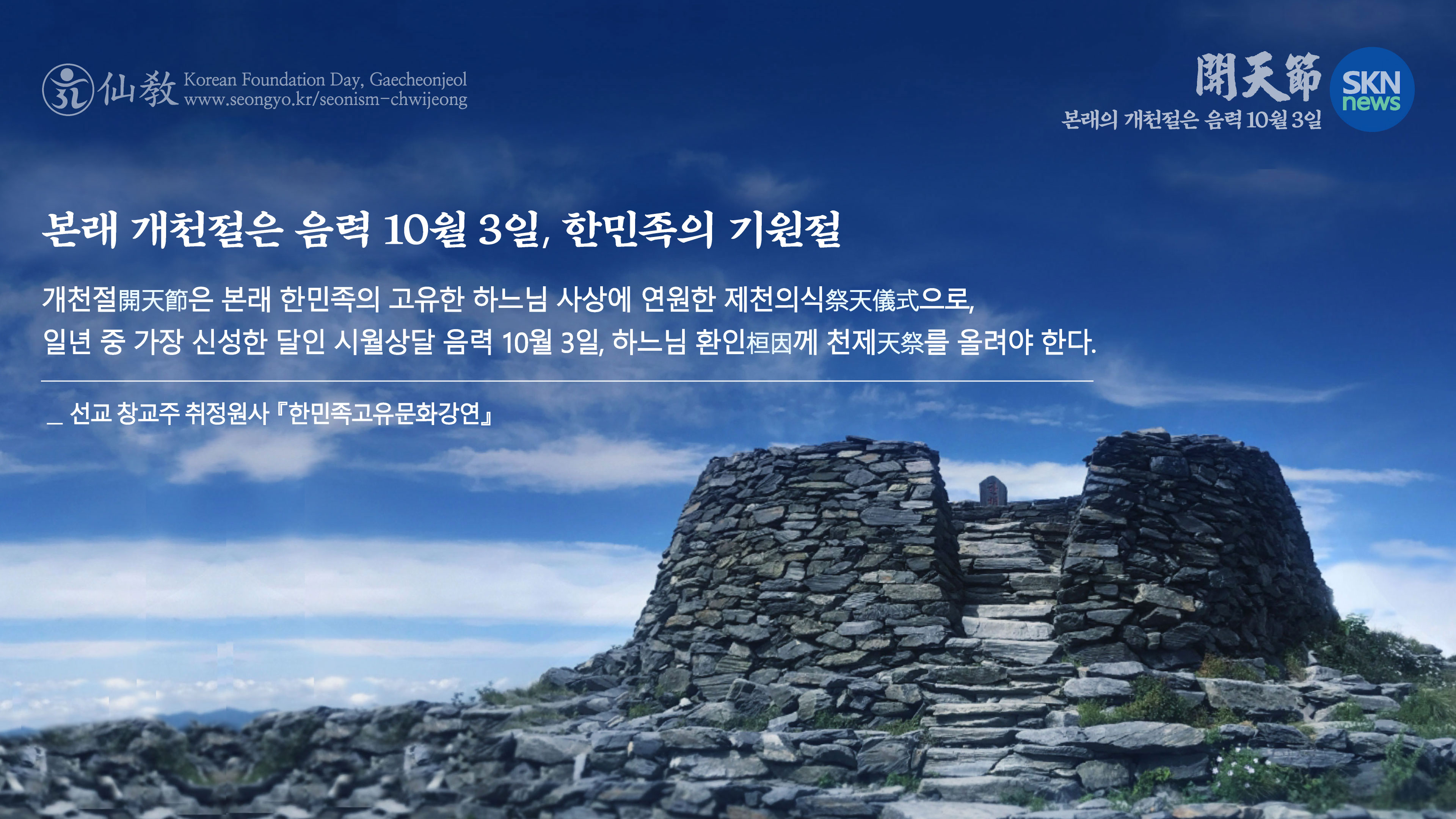 일반적으로 단군왕검의 고조선 건국일이나 환웅천왕의 신시배달국 건국일 또는 신시개천을 기념하는 날로 알고 있으나, 환인桓仁의 환국개천, 환웅桓雄의 신시개천 단군檀君의 소도개천은 모두 한민족의 시조이시며 하느님이신 환인상제桓因上帝님의 광명개천에서 비롯된 것으로, 환인상제님께 봉행한 고대의 제천의식에 연원하여 제천祭天하는 것입니다.