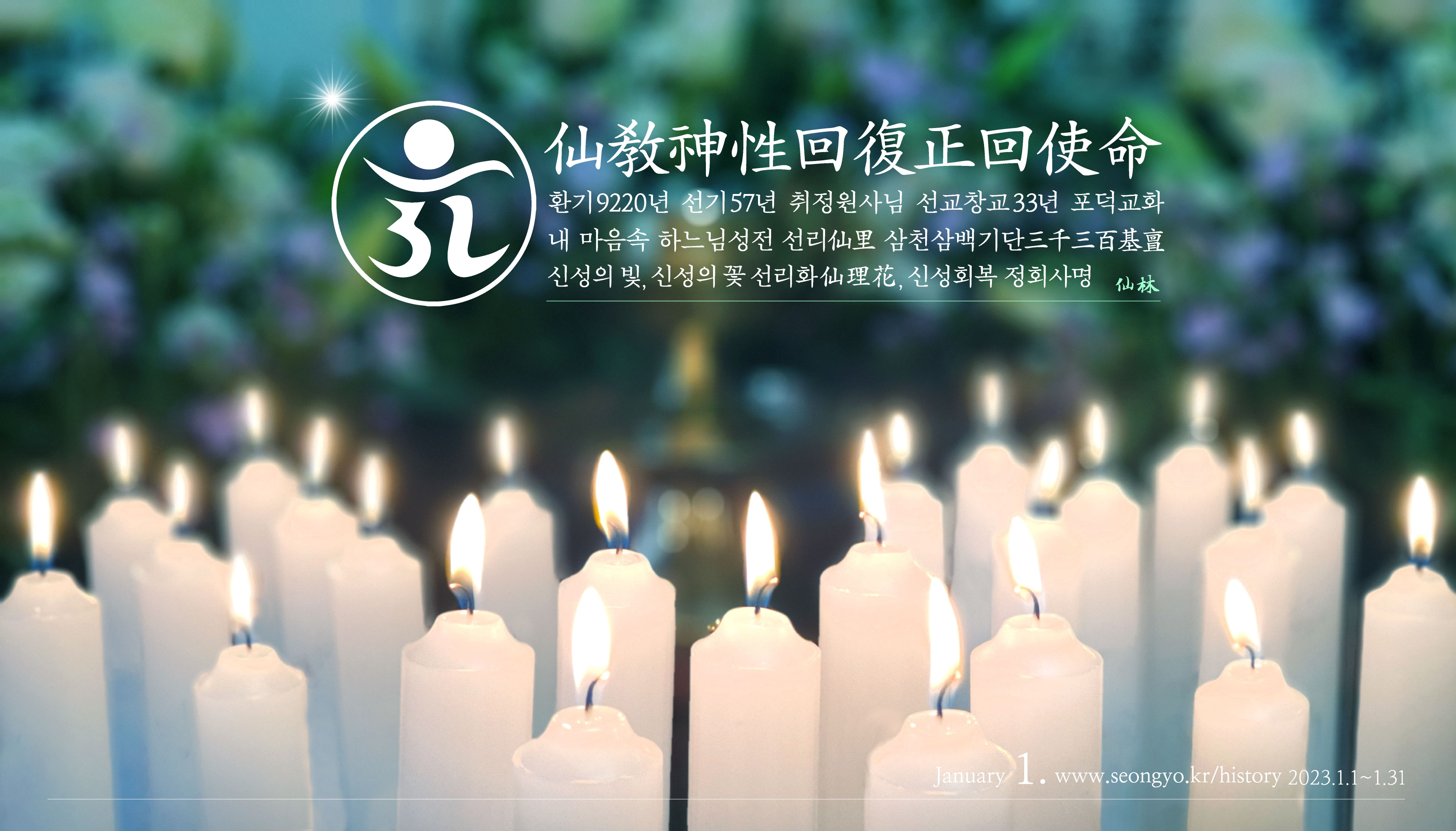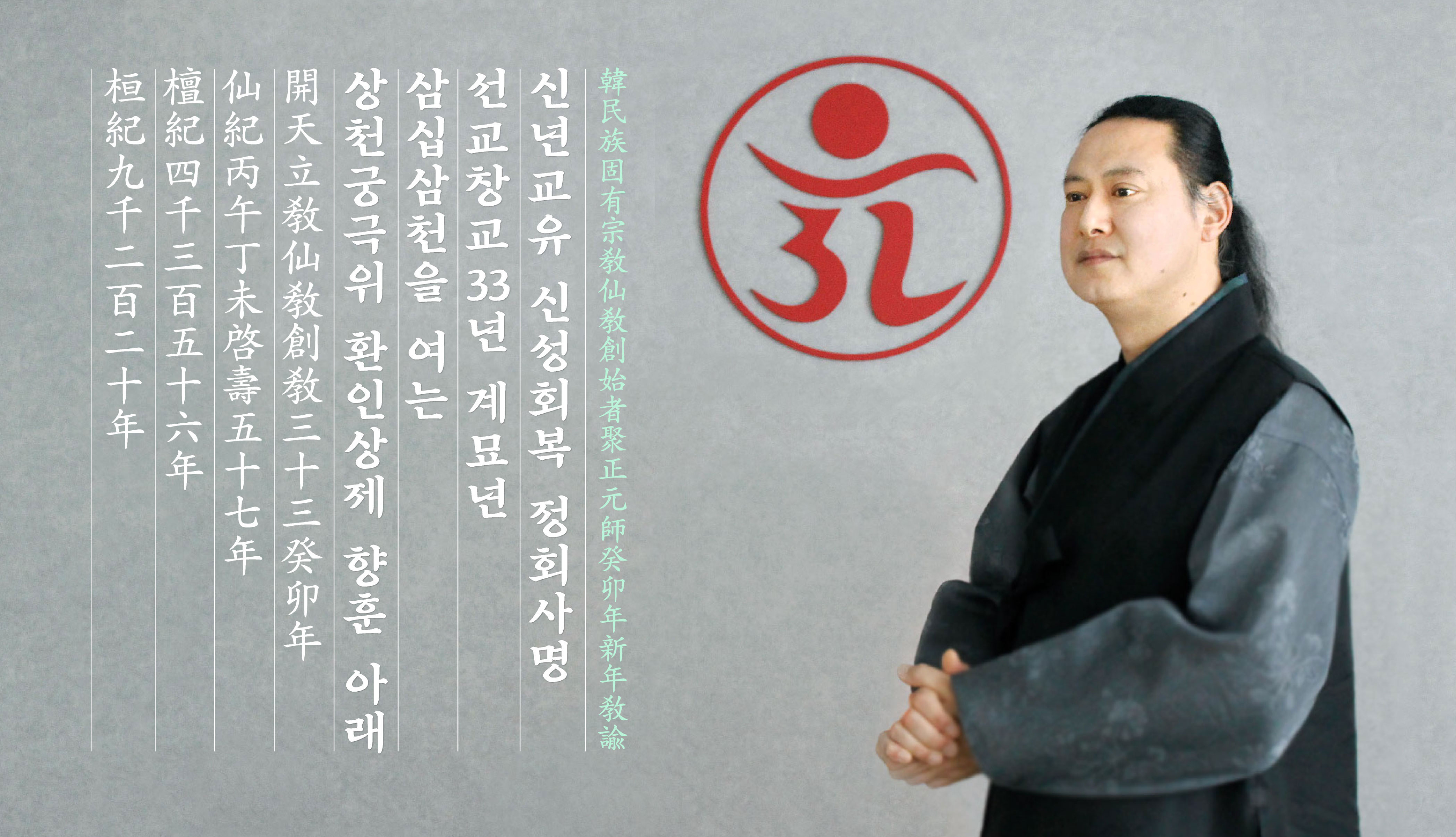 선교창교 33년 계묘년 새해를 맞아, 한민족의 시조이시며 온 세상의 하느님이신 환인상제님과 선교창교주 취정원사님, 선교 교단에 귀의하오며, 일심정회(一心正回) 합니다.