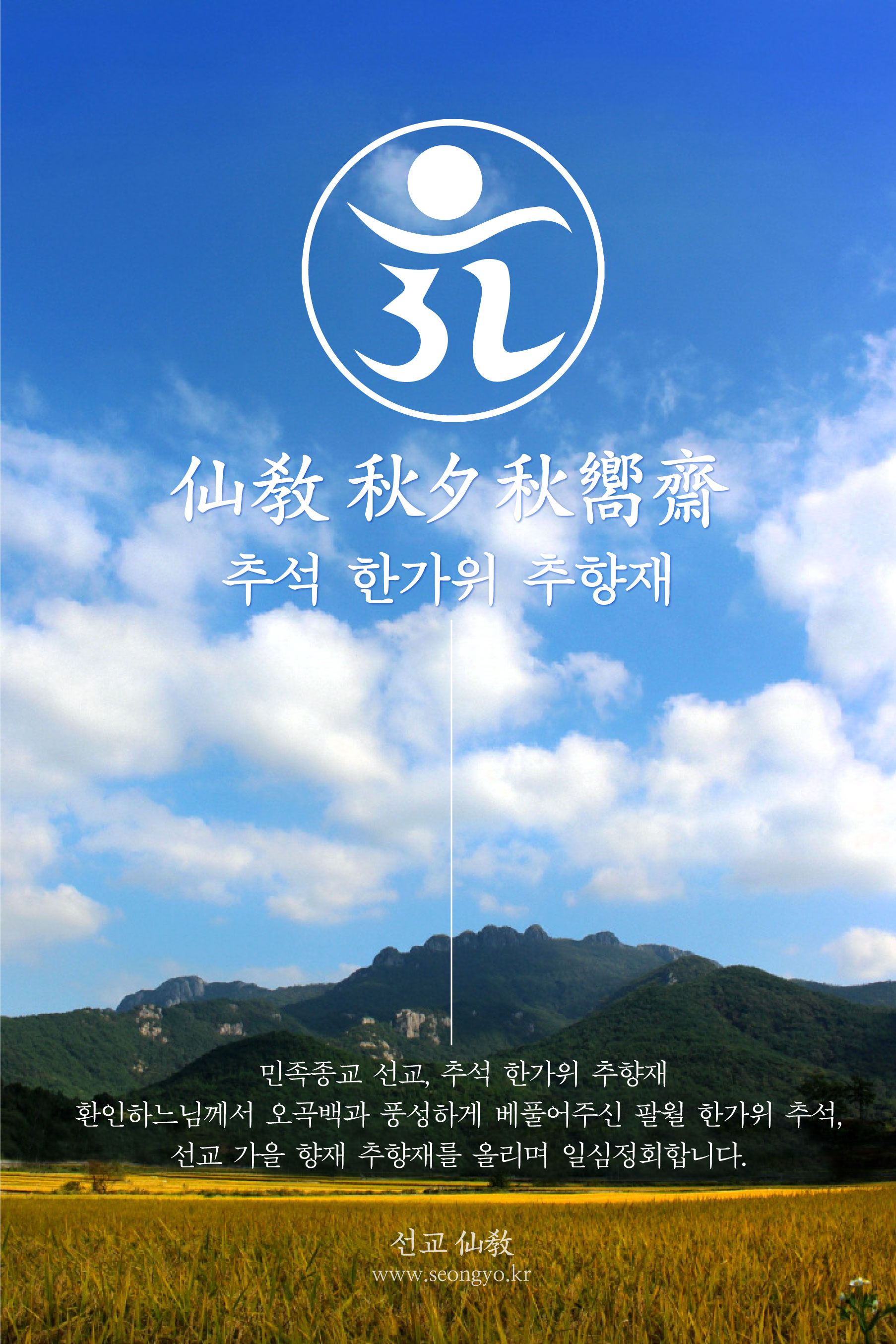 한민족 고유종교 선교(仙敎)에서는 음력 8월 15일 추석 한가위에 선교 고유의례 “추향재(秋嚮齋)”를 봉행하여 제천(祭天)합니다. 추향재의 봉행은 선교(仙敎)를 창시한 취정원사(聚正元師)님의 교유에 근거한 것으로, 한민족(韓民族)의 시조(始祖)이신 환인 하느님(桓因上帝)님께 올리는 선교 교단의 가을향재 제천의식입니다. 오곡백과 풍성하게 베풀어주신 팔월 한가위 추석(秋夕), 선교인은 창교주 취정원사님의 추향법문을 마음에 새기며 일심(一心)으로 정회(正回)합니다.