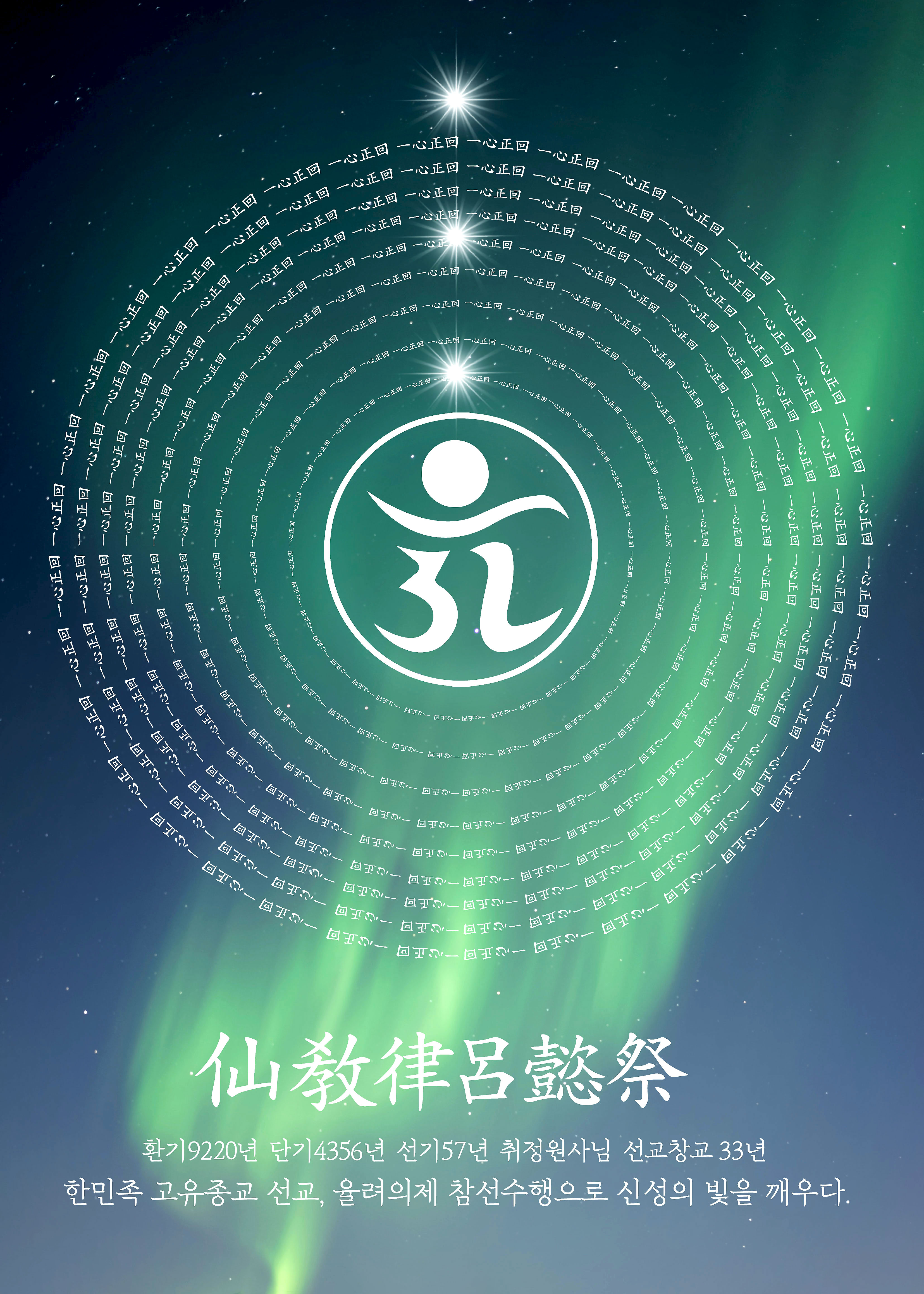환기9222년 선기59년 24절기 하지(夏至)를 맞아, 선교 수행대중은 환인하느님(桓因上帝)께서 내리시는 신성광명(神性光明)의 향훈아래, 천지인합일(天地人合一)의 선도(仙道)를 닦으며, 생무생일체 인류교화(人類敎化)에 정진하기를 기원한다.