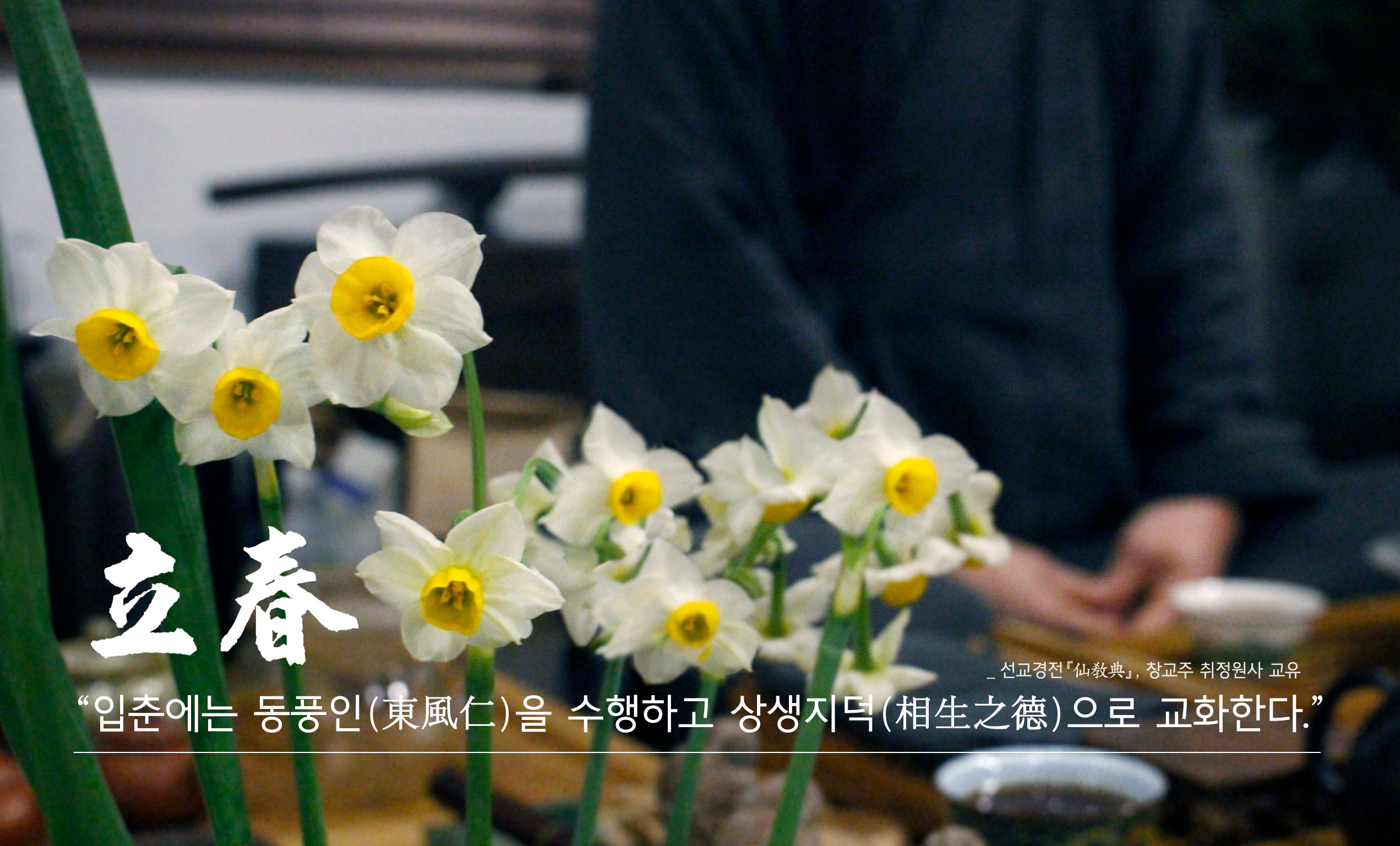 선교(仙敎)에서는 입춘 절기에 24절기 선도수행 절기체조 “동풍인(東風仁)”을 행해 천지각성(天地角聲) 율려(律呂)에 순응합니다. 동풍인(東風仁)은 입춘일(立春日) 입춘시(立春時)에 시작하여 우수(雨水) 전까지 매일 자시(子時)에 수행합니다. 아직은 추운 가운데 동풍(東風)이 불어 산천(山川)이 낮은 기지개를 켜듯 일어나 정좌하여 평정운(平正韻)합니다. 이어 “人” 자(字)로 수인(手印)하여 궐음경(厥陰經)을 활생(活生)함으로써, 초목(草木)이 소생(蘇生)하듯 심신의 정기(精氣)를 일으켜, 목(木)의 기운인 어진 마음 “인(仁)”으로써 간(肝)을 생하고 청안(淸眼)하게 하늘을 우러름으로써 새 봄의 순수(純粹)함이 심중(心中)에 충만하게 되는 것입니다.