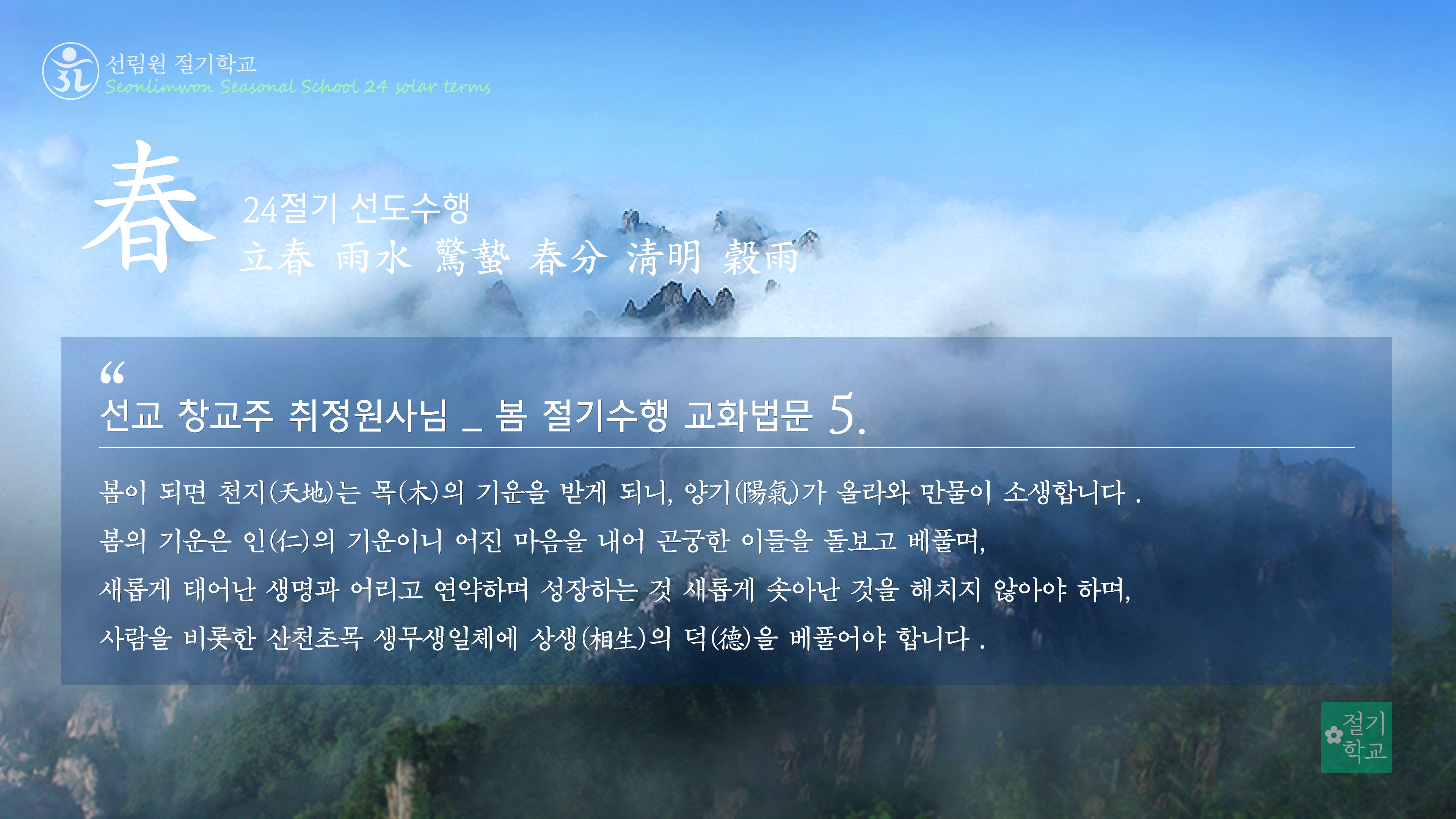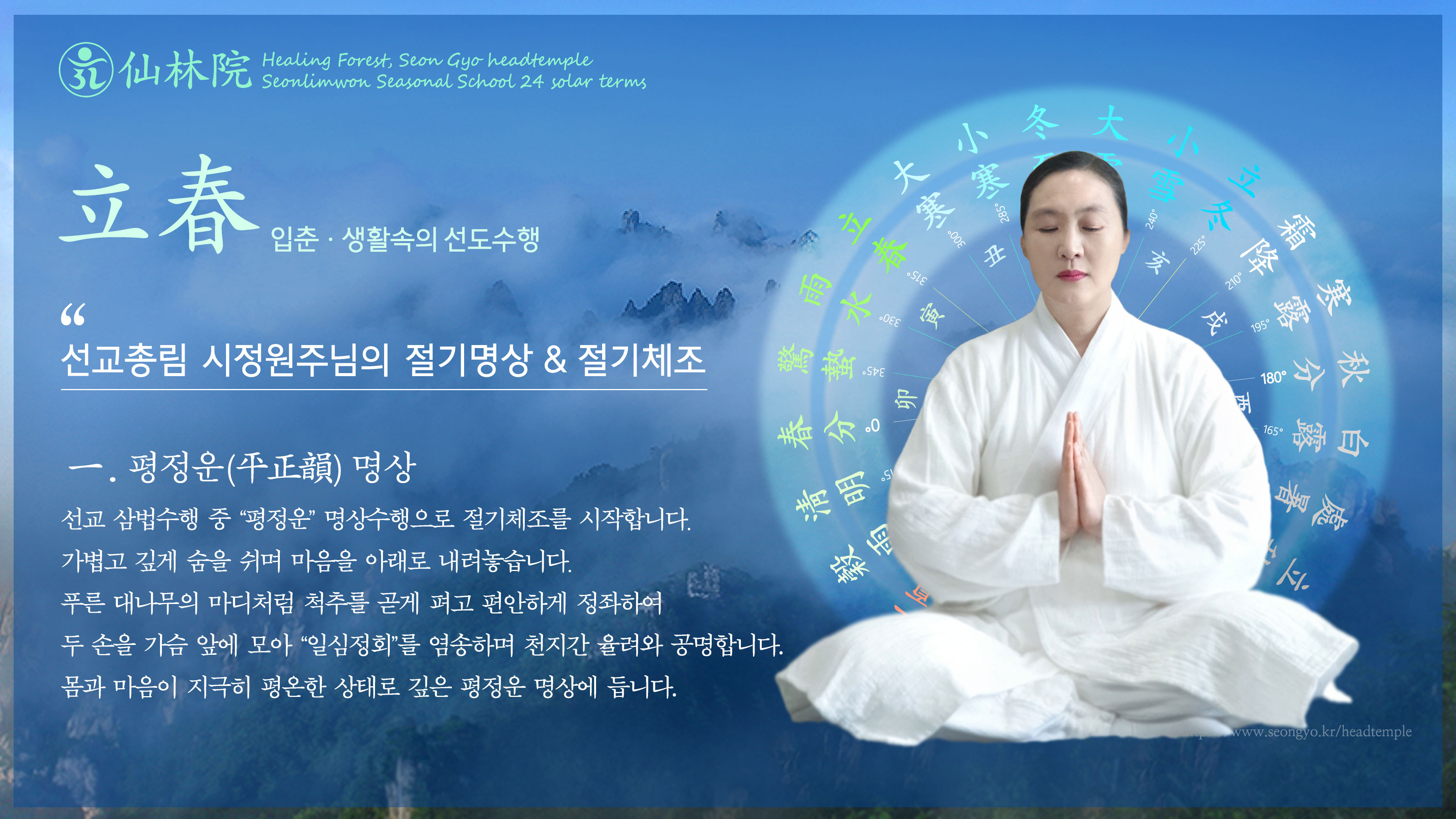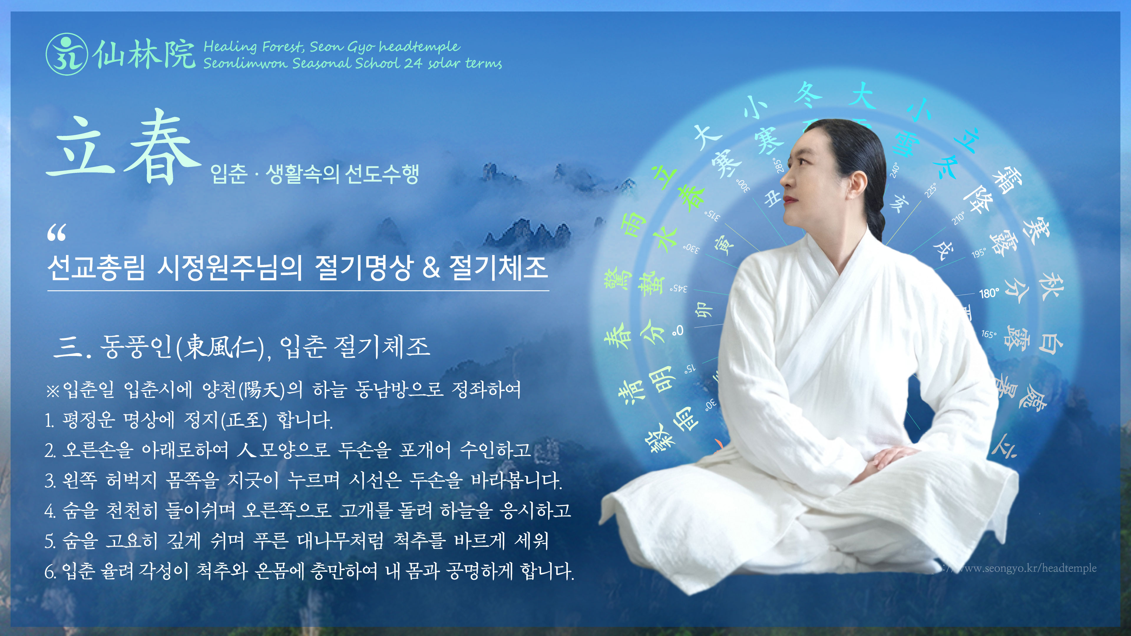 이 중, 24절기 "입춘(立春)"의 선도선법 "동풍인(東風仁)" 수행법을 실어 선교인의 정진을 독려합니다. _ 선교총림선림원 선교문화원 "선화원(仙花院)".