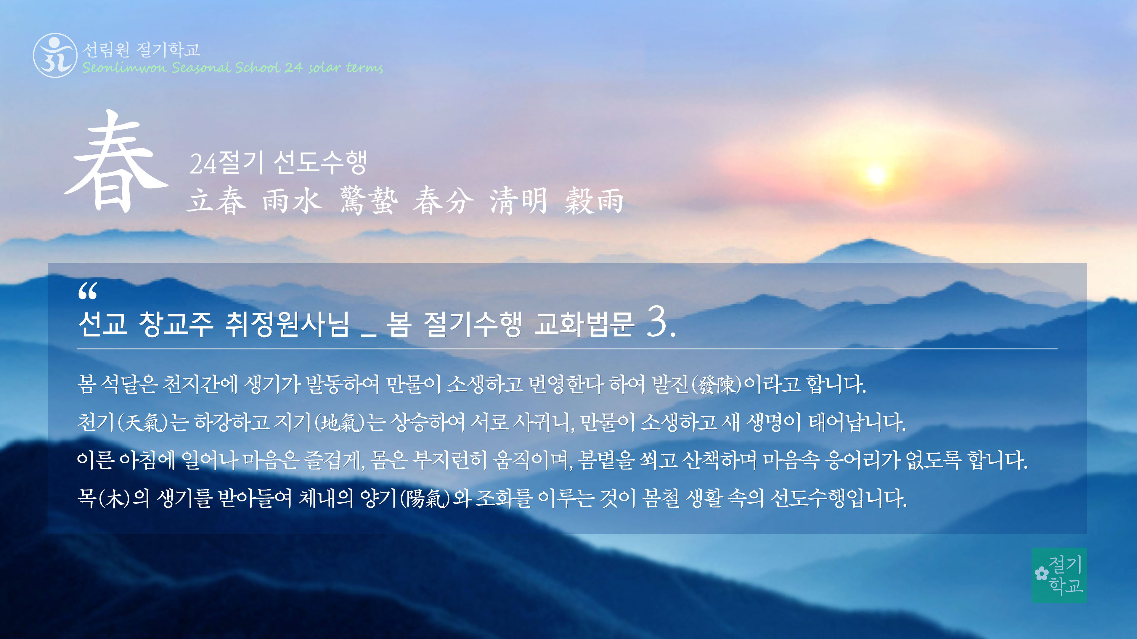 ※취정원사님의 입춘절기 선도법문을 마음에 깊이 새기며, 절기명상과 절기체조 수행에 임하도록 합니다.